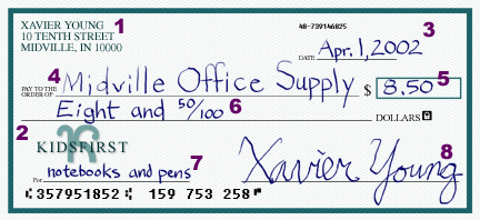 When you get older you will probably open a checking account at your credit union. A checking account lets you write checks to pay for things, instead of using cash. Each time you write a check you are giving the credit union permission to take money from your account and pay it to the person or company you have written the check to. For example, the check below is a note from Xavier to Kid's Credit Union saying it's okay to take $8.50 from his account and give it to Midville Office Supply.